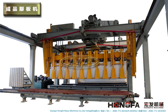 翻转吊具将坯体(带模具、侧板)在空中翻转90度,吊放置切割台或切割小车上,脱模进行切割。另外,将脱模下来的模框与返回的侧板进行组模,吊运至浇注回车线上进行循环浇注。